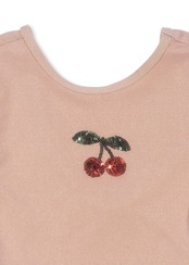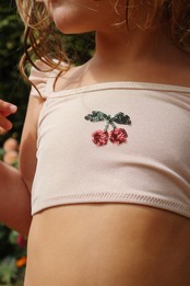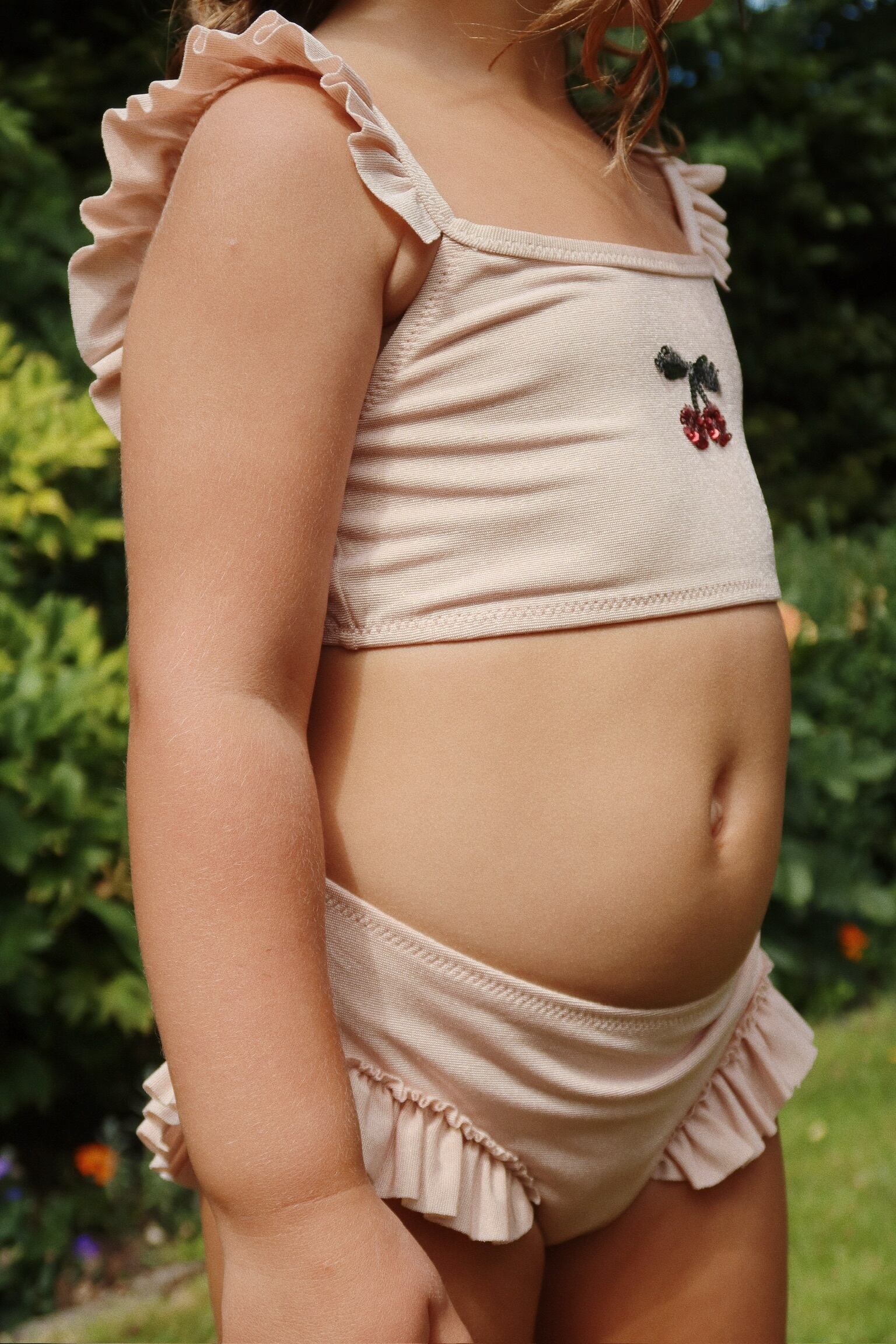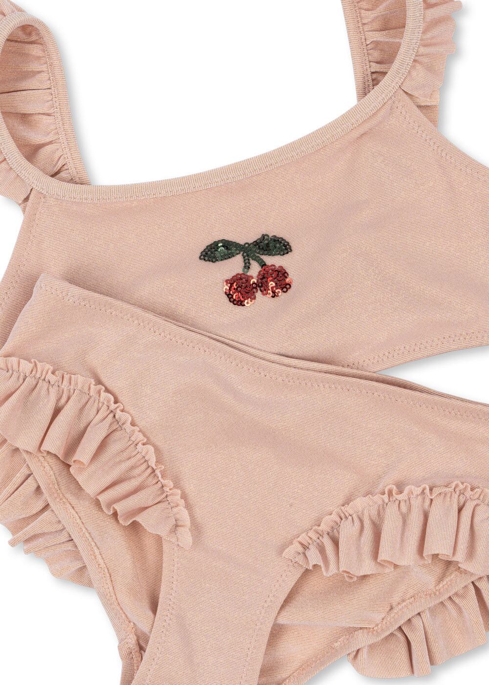 フリルとスパンコールの光沢のあるチェリーが可愛いビキニです。